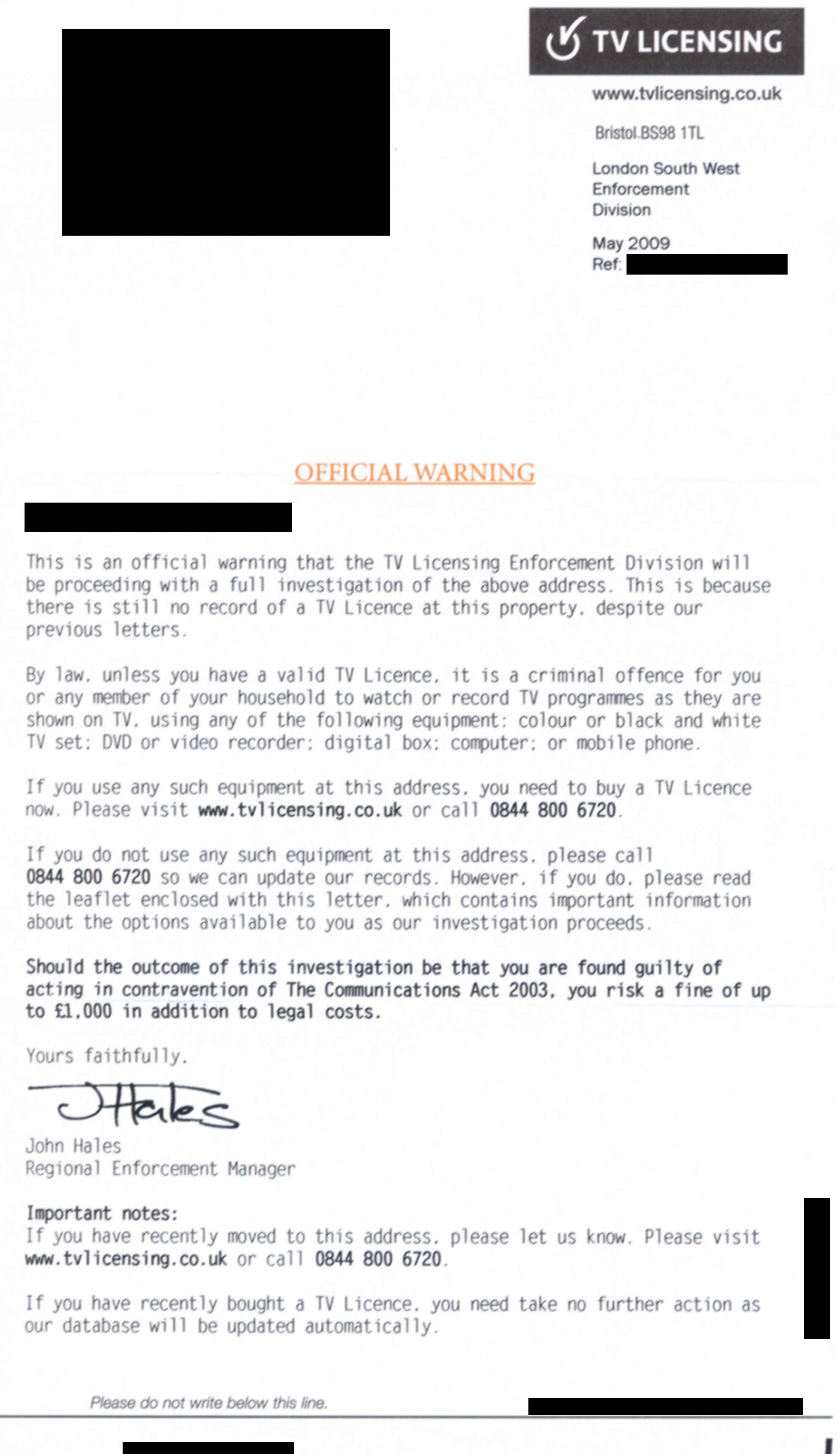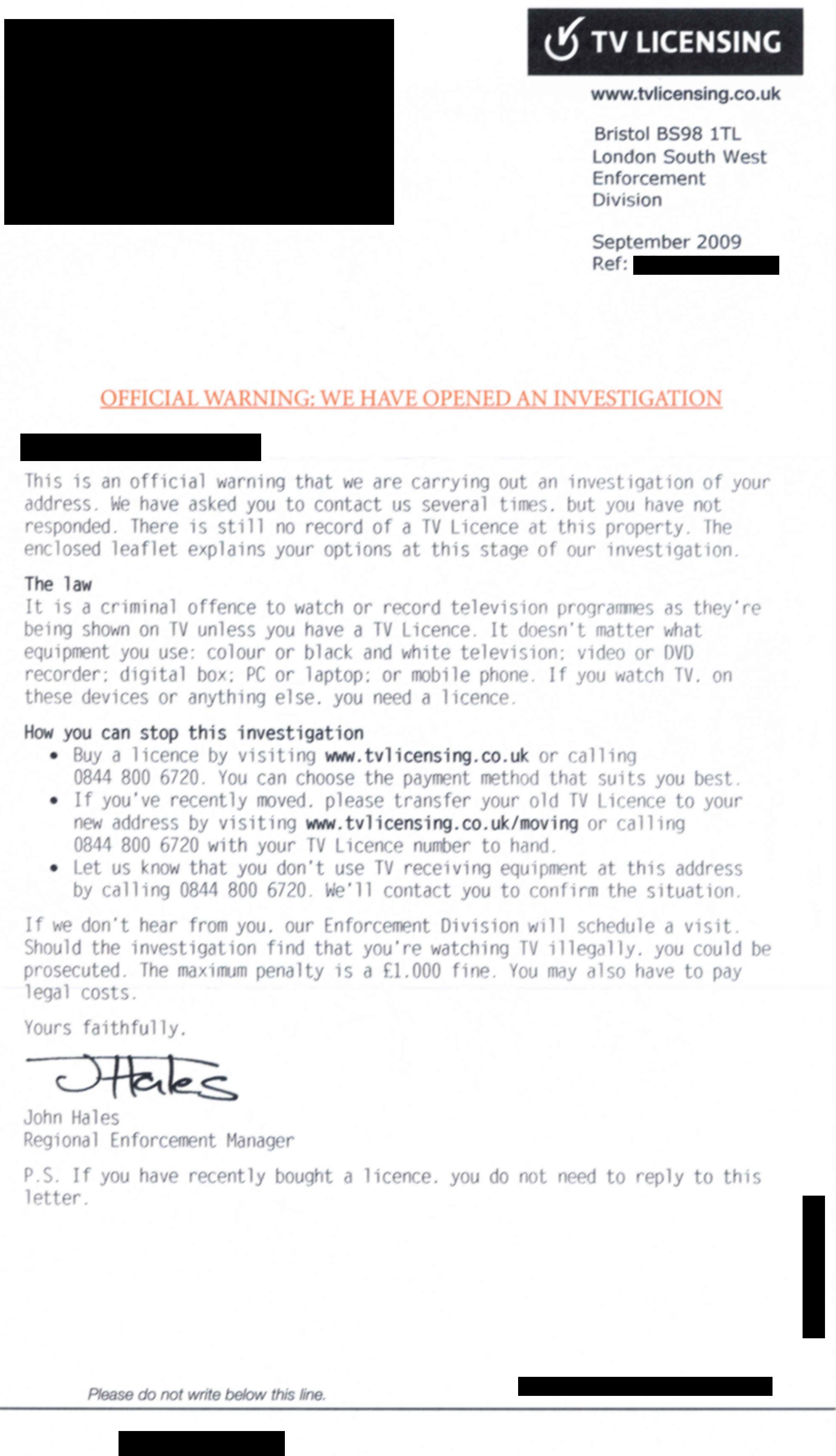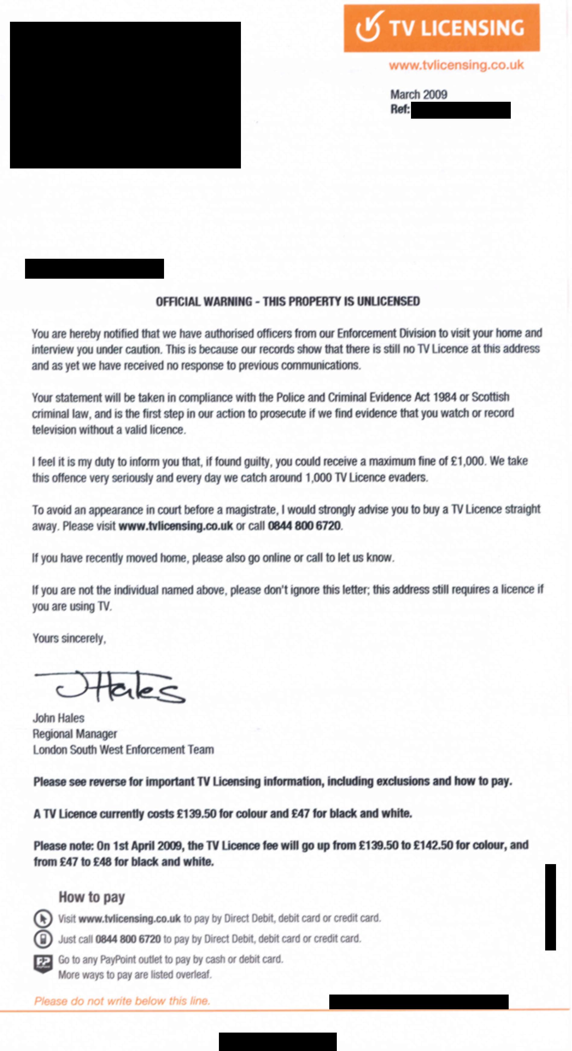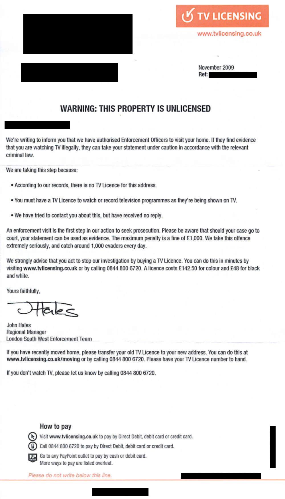 unlicensed person. I have now saved £546 by not paying TVL/BBC and,
