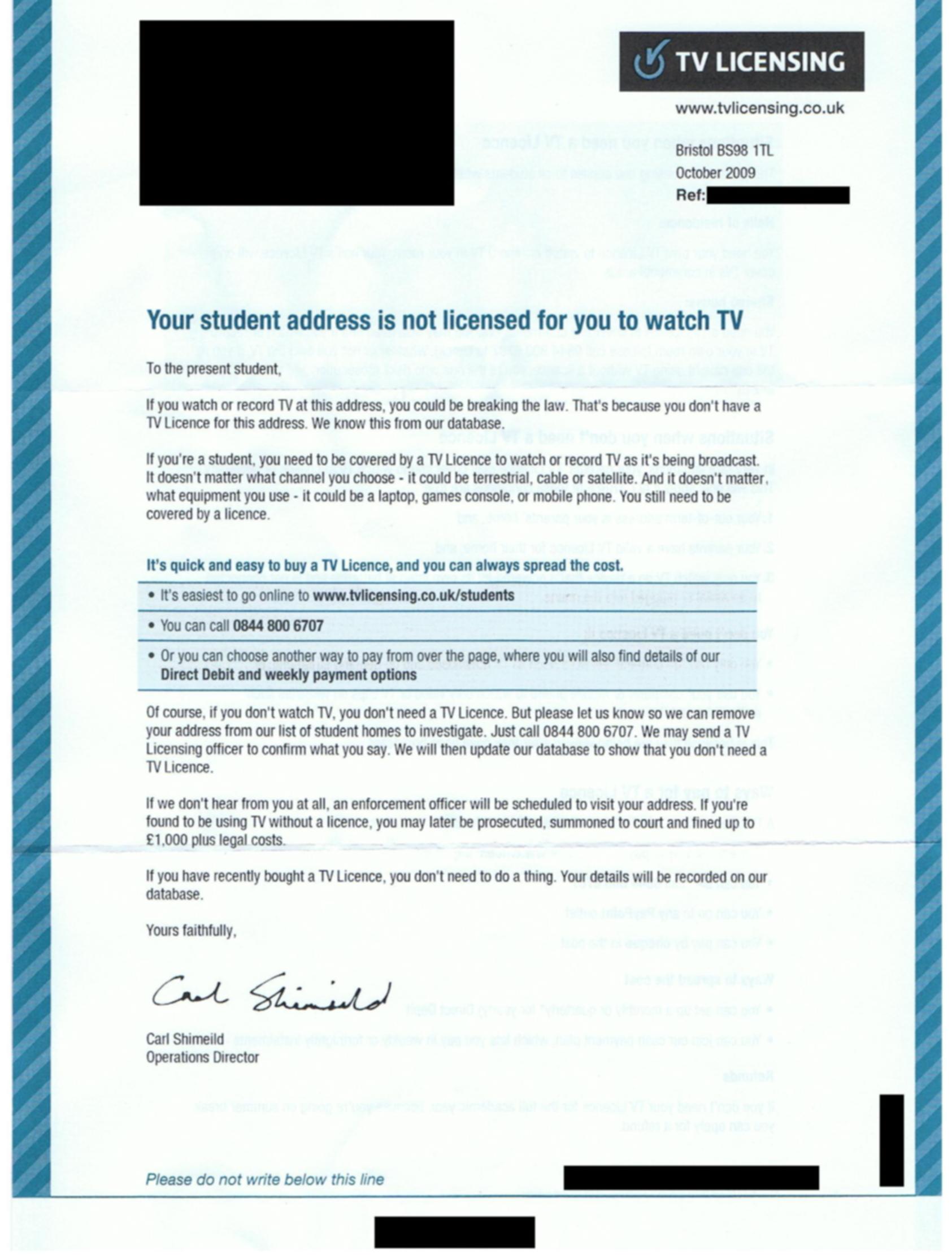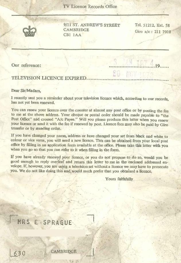 A TV licence letter from January 1974: