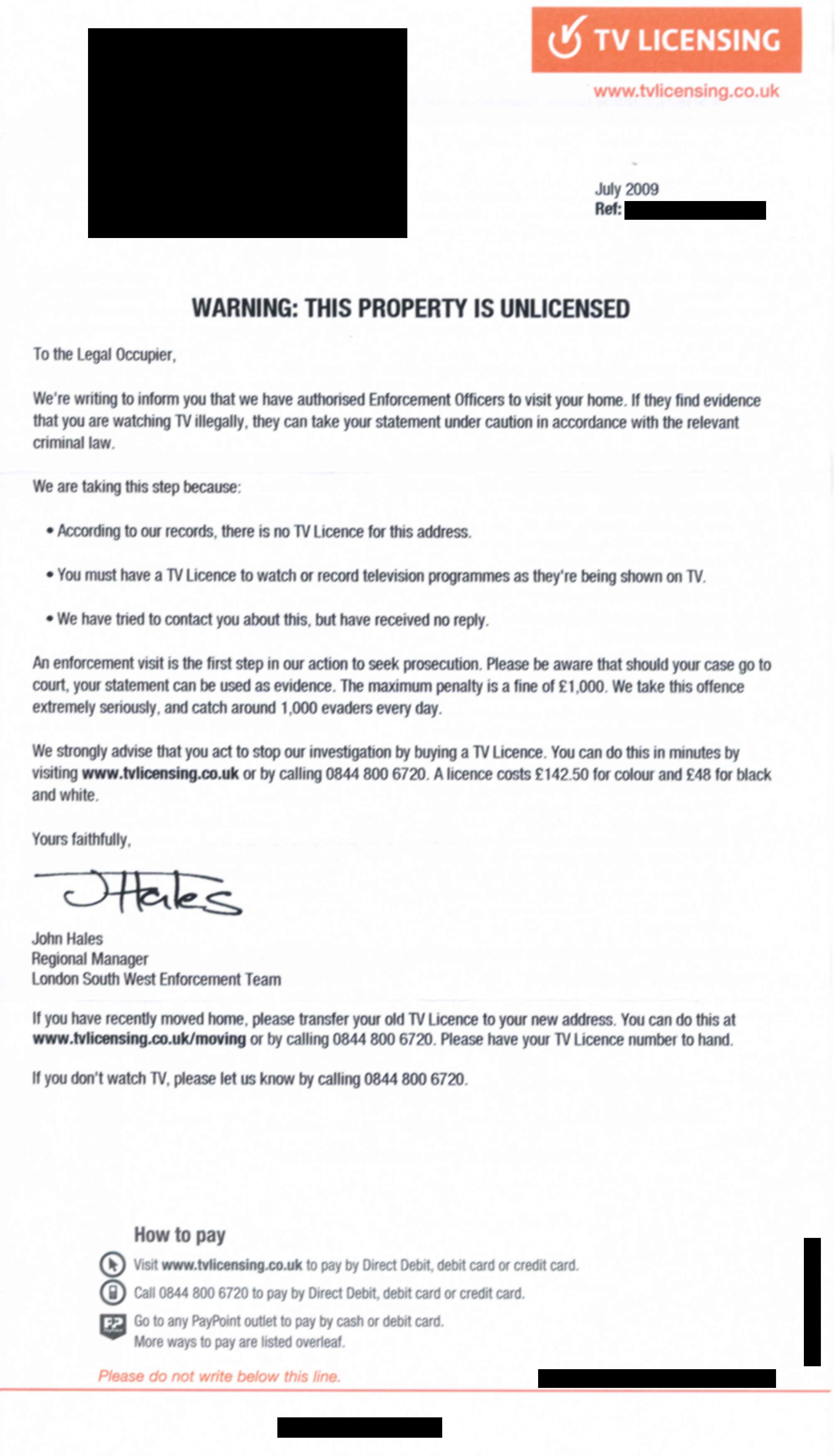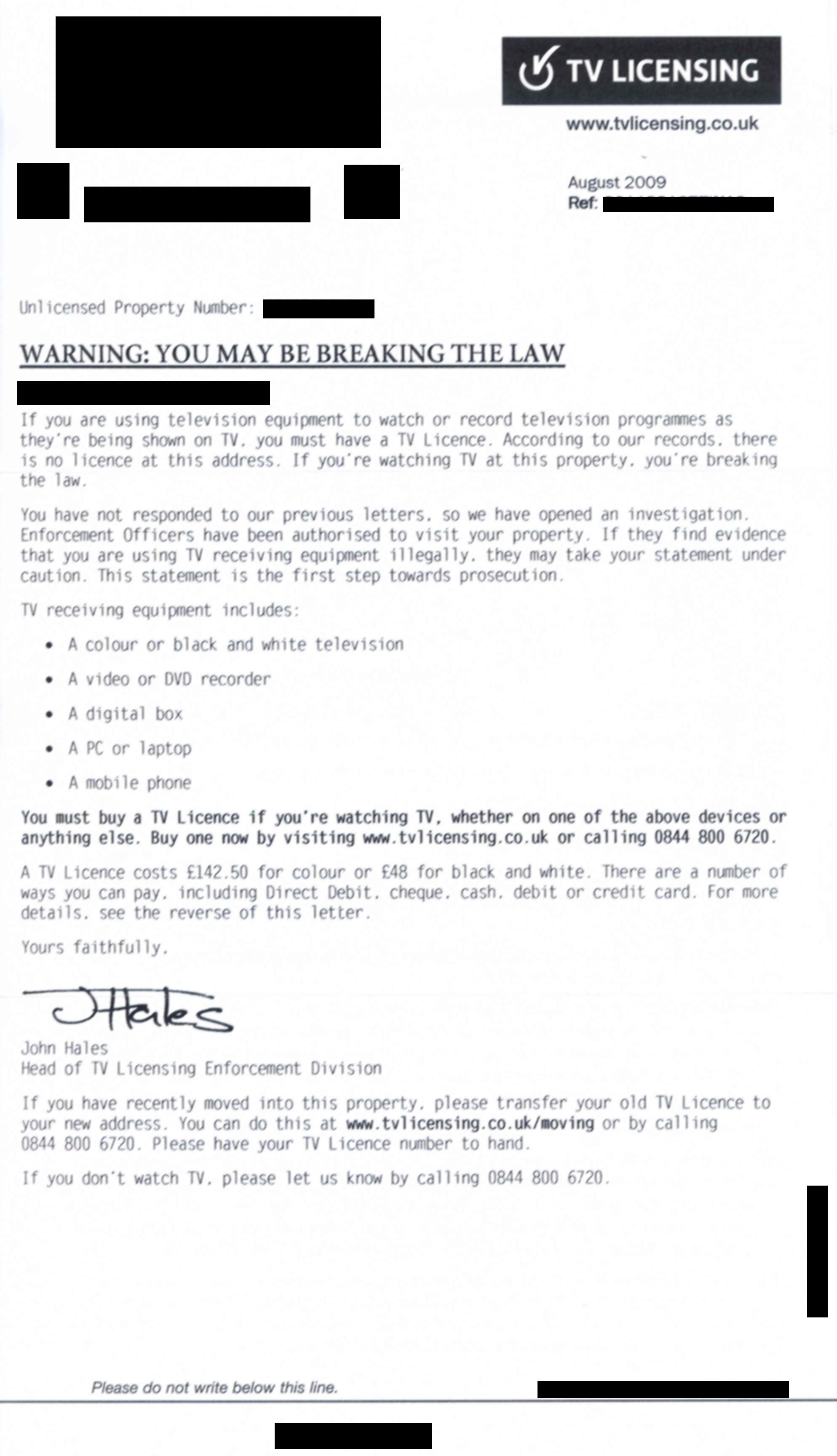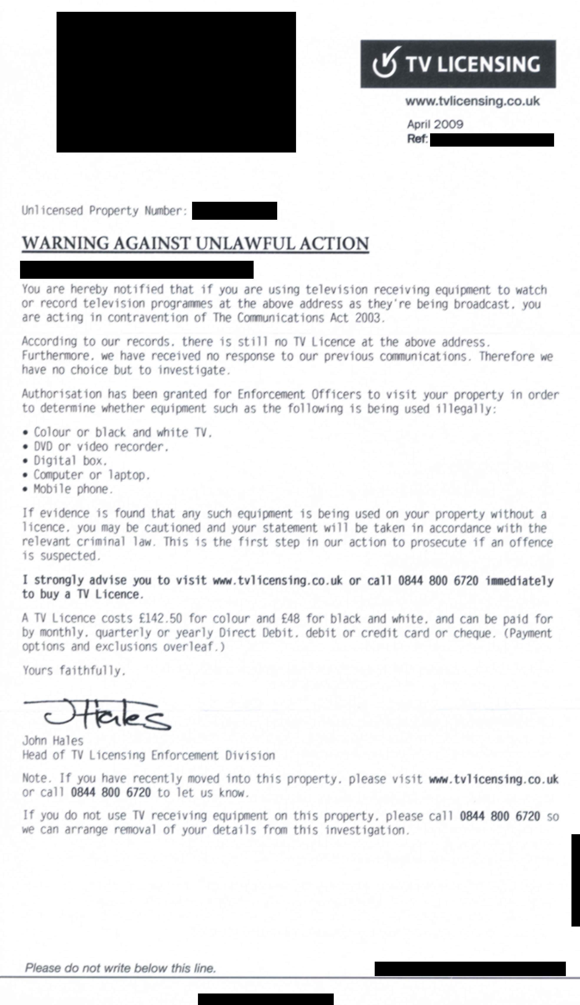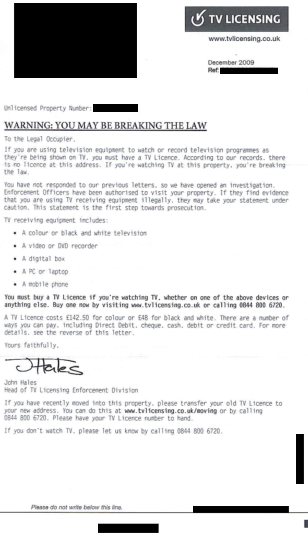 unlicensed person. I have now saved £546 by not paying TVL/BBC and,